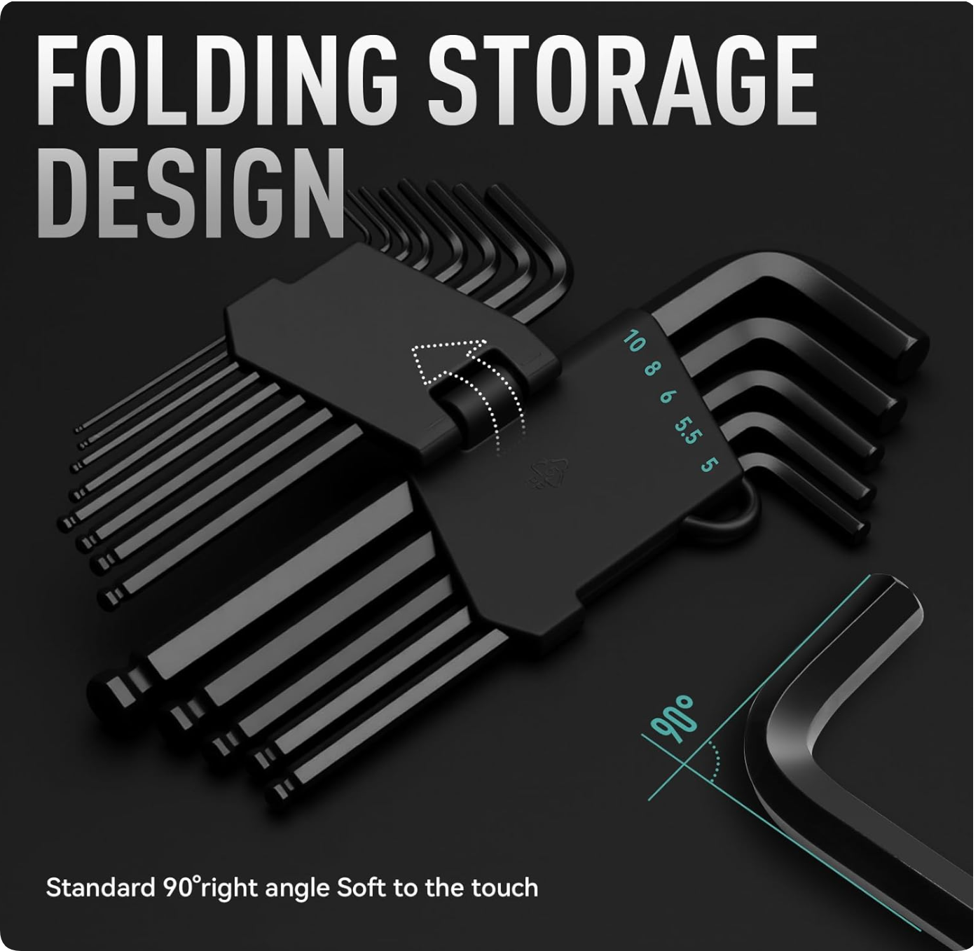 13 Pieces Metric Allen Key Sets provide Metric Sizes including: 1.27, 1.5, 2, 2.5, 3, 3.5, 4, 4.5, 5, 5.5, 6, 8, 10mm. Every hex key is labelled with specific sizes on the surface so that you can easily get the size you want