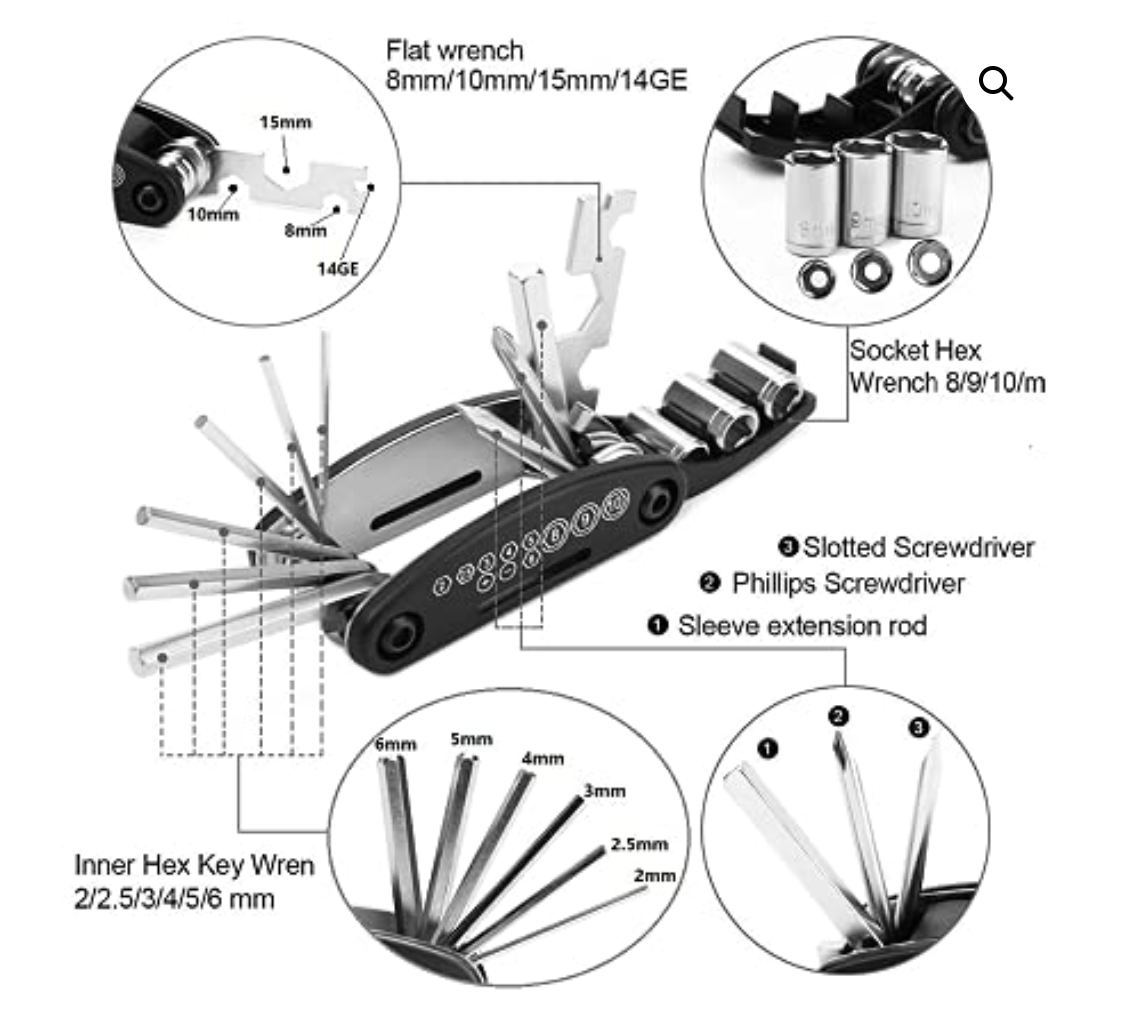 Features : * Set includes 2, 2.5, 3, 4, 5, 6 mm Hex key. * 1/4" Drive with 8,10,12 mm sockets. * 8, 10, and 15 mm open wrench. * Phillips and slotted screwdriver. * Convenient carry pouch included.