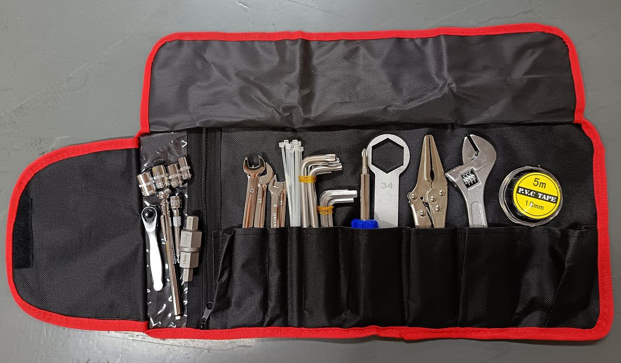 Kit includes 4pcs metric combination end spanners, single end axle wrench,adjustable wrench,6 in 1 screwdriver, lock grip, mini ratchet handle,socket extension bar, 3pcs metric sockets, 5pcs metric L hex keys, 6pcs L Torx keys, pen type tire pressure gauge,4 in 1 axle adaptor,electric tape,nylon cable ties.