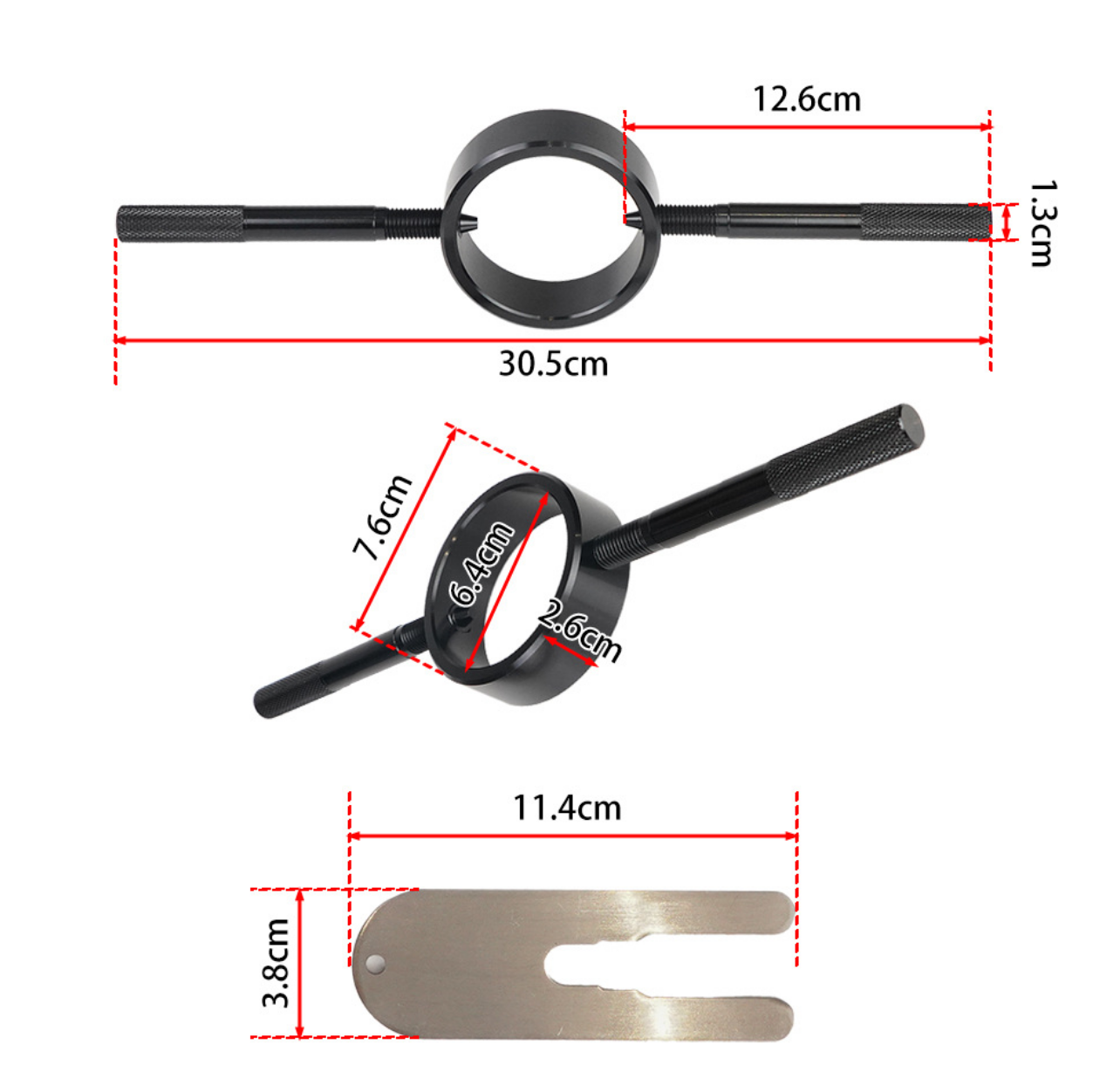 * Tool allows simple adjustment of spring preload (to adjust height) without damaging shock or spring collars.Fitment: Fork spring compressor kit is an absolute necessity for anyone who intends to service or change springs in an inverted cartridge fork. Material: The compression tool is made of aluminum and it won't scratch your fork like steel ones; The spacer is made of high quality steel, strong and durable. Usage: Simple screw in pins for location on the spring top spacer. Pulling the fork tubes near the top makes it easier to use. Function: Designed to compress the fork springs to allow access to the top cap lock nut, for assembling and disassembling. Can also be used to change seals, springs, bushings, cartridges, oil, or just to service your forks. Application: Easily thread onto the damping rod to facilitate cartridge fork bleeding and prevent the typical mess when changing fork oil.