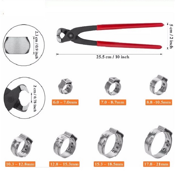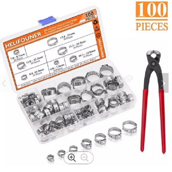 * High quality single ear stepless Hose Clamps in a clear box, very easy to install and store.