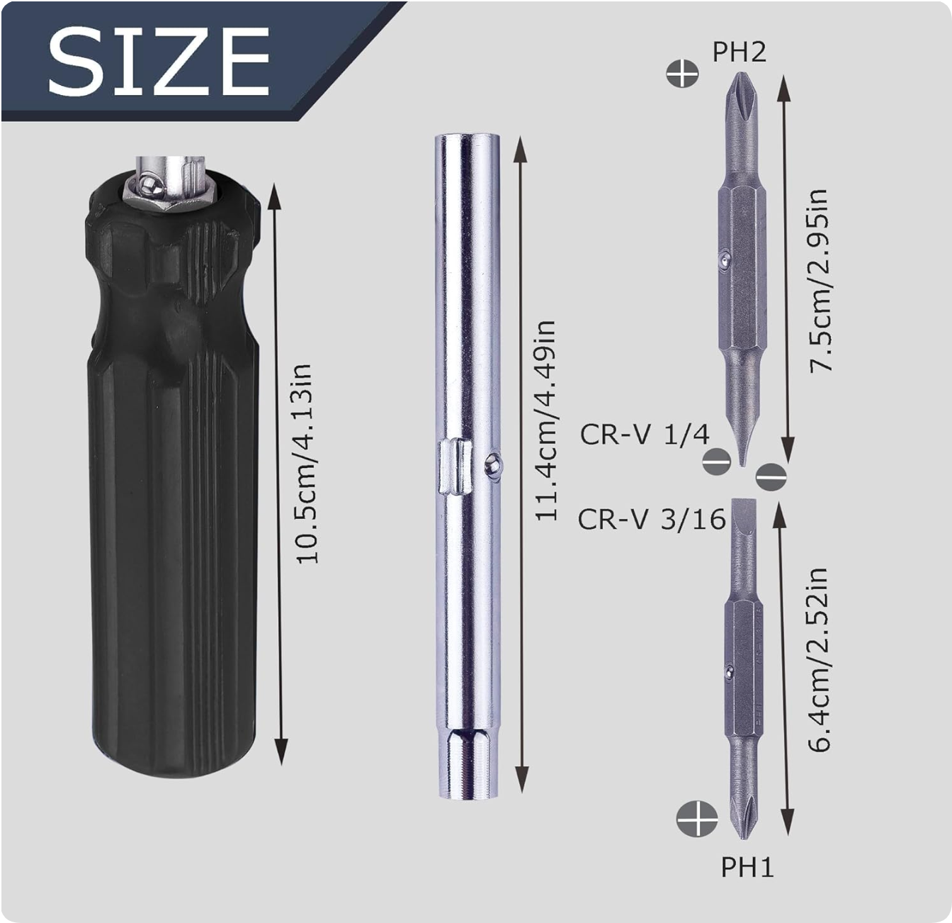 ✔Includes: 1-pc. 6-in-1 Driver Handle; 1-pc. Nut Driver Bit Tube: 1/4 in. x 5/16 in.; 1-pc. Phillips/Slotted Bit, 1/4 Inch Shank: #1 x 3/16 in.; 1-pc. Phillips/Slotted Bit, 5/16 Inch Shank: #2 x 1/4 in.