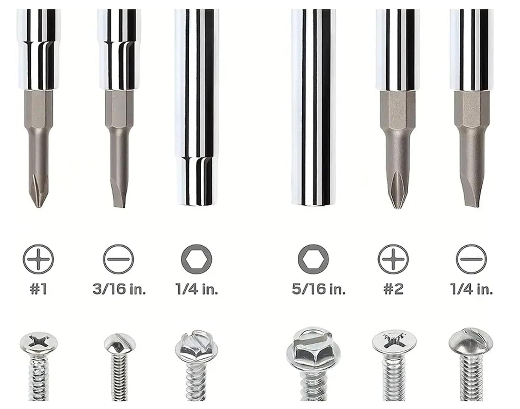 • ✔Includes: 1-pc. 6-in-1 Driver Handle; 1-pc. Nut Driver Bit Tube: 1/4 in. x 5/16 in.; 1-pc. Phillips/Slotted Bit, 1/4 Inch Shank: #1 x 3/16 in.; 1-pc. Phillips/Slotted Bit, 5/16 Inch Shank: #2 x 1/4 in.